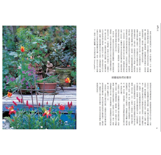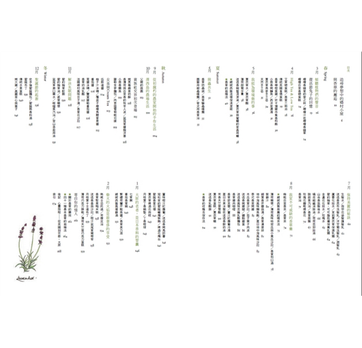 全書以春、夏、秋、冬的時序,在每個月分裡以溫暖的散文帶出當月的心情筆記,接著分別介紹生長於不同季節裡的花草,並加以說明各種香草適用的療效及料理方法。