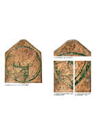 如今訪客前往赫里福德,走進大教堂的附屬建築仔細端詳mappamundi,一開始會覺得這東西真不對勁,當作地圖就更不對勁。形狀宛如房屋的山牆端,地圖表面起伏有波紋,活像一頭神祕的動物——事實上也是如此。這張地圖有一點五九公尺(五呎二吋)高,一點三四公尺(四呎二吋)寬,用一張巨大的獸皮製成。從地圖最高點的脖子,到貫穿地圖中央的脊椎,動物的體態依稀可見。乍看之下,地圖可能像個骷髏頭,或是屍體的橫斷面,公然展示血管和器官;再看一眼,可能是一隻怪異、蜷曲的動物。托勒密和伊德里西那種測量網格不見了。這幅地圖反而散發出一種近乎有機的氣氛,體現了一個混亂、豐沛的世界,充滿奇景,但也不乏恐怖的畫面。