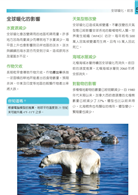 2. 全球暖化的影響:氣候變遷、惡劣天氣、熱浪、春天早到、颶風強度增強、北極冰融、海洋酸化、動植物遷徙、野火