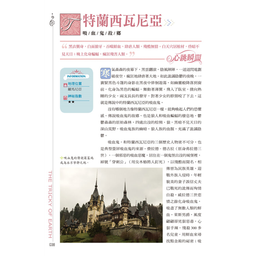 每一個神祕地帶發生的離奇事件都標明了確切地區位置與神祕指數,激起讀者對世界充滿更多的好奇、挖掘隱藏在各地更深的祕密。