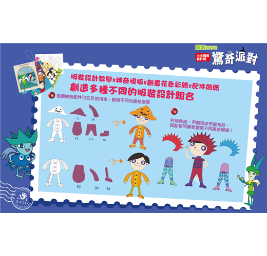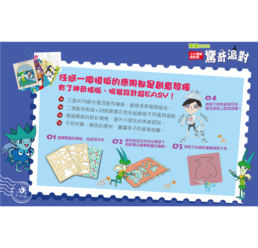 本書以畫畫教學出發,帶入服裝設計的教學,利用內附的神奇模板、配件貼紙、創意花色彩紙等,將創造出多款服裝組合,從平面服裝的輪廓,到服裝色彩搭配的立體拼貼,設計獨一無二的服裝吧!加上棉線吊掛起來,還可以來場酷炫的驚奇派對,增加趣味性,進而啟發孩子的創意思維與創造活力哦!