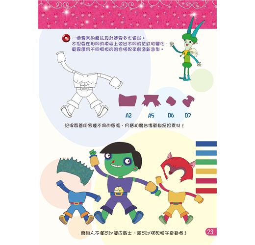 • 二張配件貼紙+20款創意花色彩紙創造不同風格服裝。