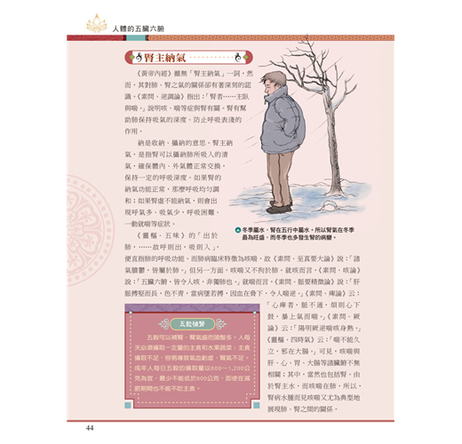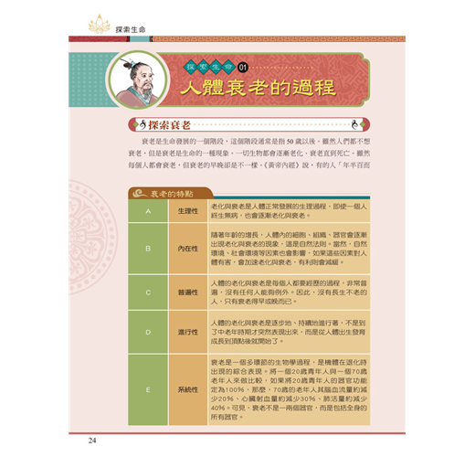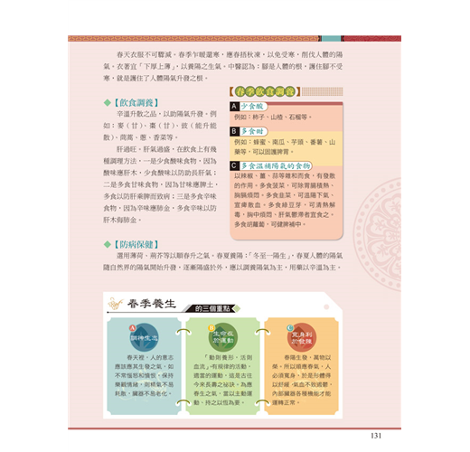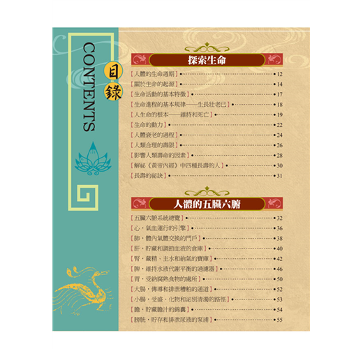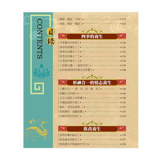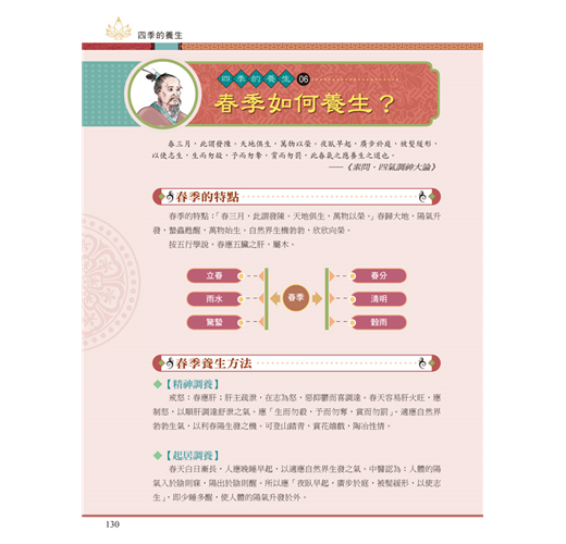 擷取《黃帝內經》養生精華,薈萃中國千年醫學智慧,完整呈現中國古人對於人體與四季變遷的獨特見解,及人體各部相應的整體觀念。