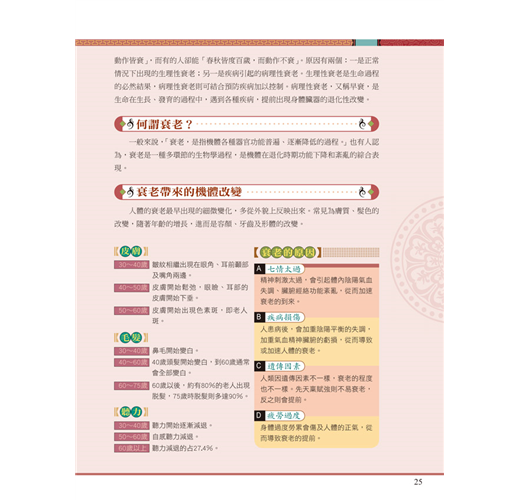 本書擷取《黃帝內經》養生精華,化繁為簡,白話解析四季養生的原則,讓你一年四季長保健康;精美圖片解說人體奇經八脈,讓你按對穴道,延年益壽;簡明表格清楚呈現養生要點,讓你一目了然,輕鬆養生。更分門別類整理貼合時下的養生祕訣,提供廣大讀者實用的養生方法,讓忙碌的上班族能透過調整作息、適當飲食,常保健康;為衝刺中的考生選擇合適的食物,增強記憶力;幫助苦於更年期的女性調適心情、調節飲食,克服更年期障礙,安穩渡過低潮期;協助老年人,調整心態、減少心理負擔,重新燃起對生活的熱情,不受「退休症候群」之苦,安享晚年。