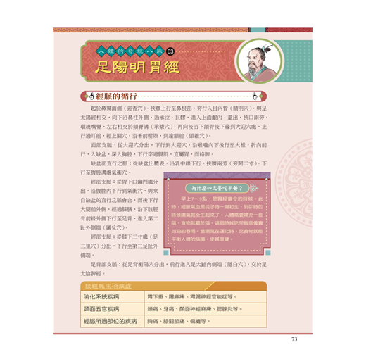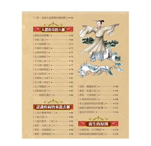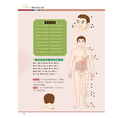 一張張生動的手繪插圖,詳細解說人體奇經八脈,讓你對症下藥,例如:頭痛要按哪個穴道,其穴道又屬於哪個經脈?月經失調的保健穴道為何,其穴道又屬於哪個經脈?再配合簡明圖表,歸納養生要點,讓你快速查詢,輕鬆養生。