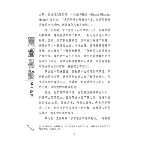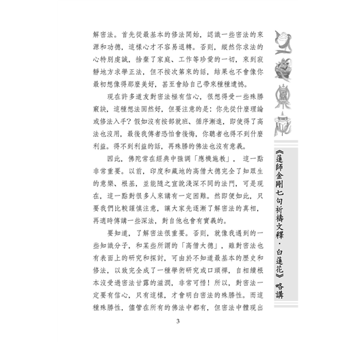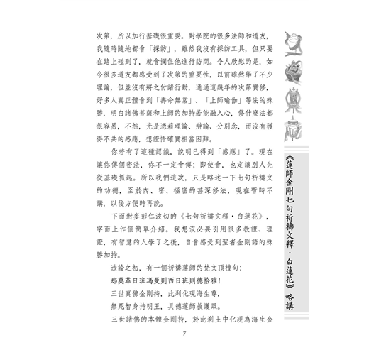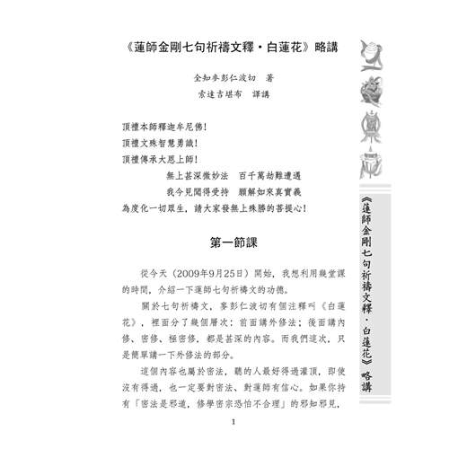 關於蓮師金剛七句祈禱文,文殊菩薩化身全知麥彭仁波切有個注釋叫《白蓮花》,裡面分了幾個層次:前面講外修法;後面講內修、密修、極密修,都是甚深的內容。本書只是簡單講一下外修法的部分。