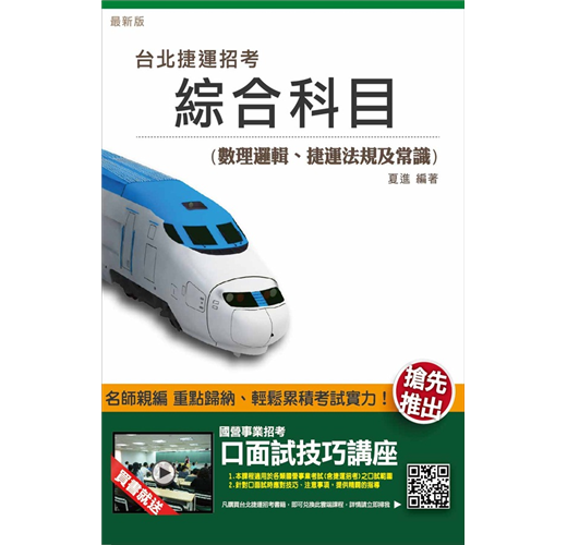 臺北捷運綜合科目(數理邏輯、捷運法規及常識),內容含括了數理邏輯、捷運法規及常識及相關試題演練,詳實彙整考科重點,讓您面對捷運招考專業科目:臺北捷運綜合科目(數理邏輯、捷運法規及常識),輕鬆取分!
