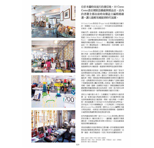 位於米蘭時尚流行的發信地,10 Corso Como書店裡附設藝廊與精品店。店內的書籍全都由前時尚雜誌主編精挑細選,讓人能輕易補捉到時代氛圍。