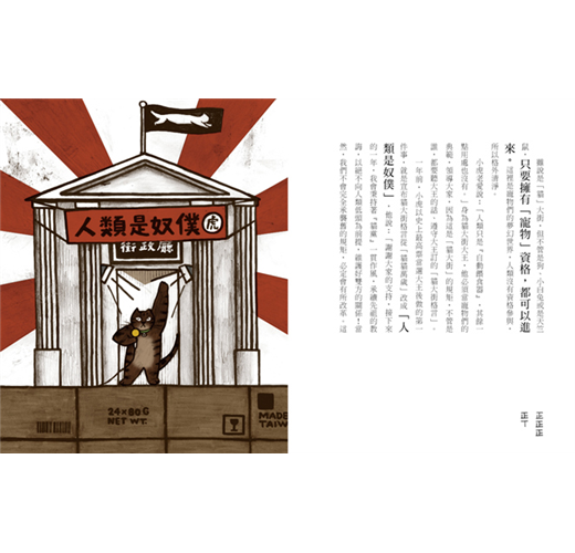 如同亞里斯多德說的:「人類是政治的動物」,貓大街現任的小虎大王也大聲發表公告:「人類是奴僕!」於是,遵守大王公約的所有寵物全都熱血沸騰了起來,因為,(自以為)統治人類世界的貓大街終於要選大王了!你想想,只要當上貓大街的大王,不但可以統治全世界的寵物們,差不多也等於統治人類世界了!哇哈哈!(咦?奇怪,是這樣說嗎?)