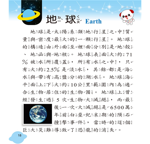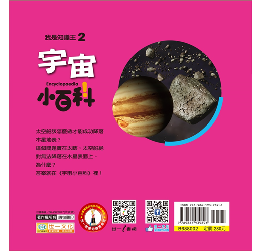 打開宇宙小百科,讓你順利脫離地球,航向無垠浩瀚宇宙! 43篇天文太空主題,從太陽系開始,讓我們認識腳下的地球,最近的星球月球,我們的太陽系,銀河系,由近而遠,逐漸逼近宇宙的疆界。 不只介紹星球,也介紹人造衛星及星球探測器。人造衛星有什麼功能?幫助我們不會迷路的GPS竟然和衛星有關!連我們打電話,也不能沒有人造衛星。人造衛星和星球探測器,有什麼不同?星球探測器能探測什麼?