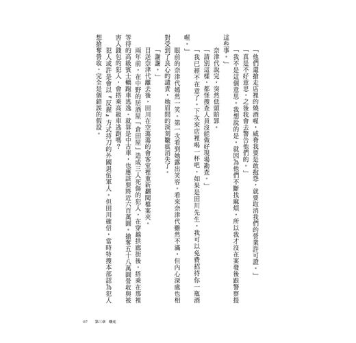 他們緊急部署現場附近的中野街、早稻田街,以及新目白街和環狀七號線。主管竊盜犯的本部三課也加入調查,開始從龐大的犯罪手法資料中進行比對。下一頁寫著初期搜查的概況。