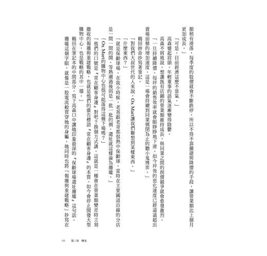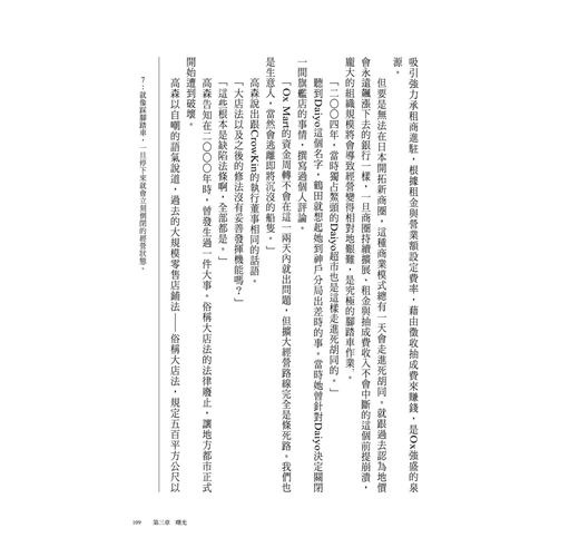 『常在顧客身邊』這句標語,聽在消費者耳中是十分動聽。但對同業者來說,卻等同是宣告死刑。向批發商施加壓力,讓他們延後提供商品給同業;買下鄰近土地開設店面,直到對手投降為止絕不放緩攻擊手段、強硬地壓制市場,是Ox Mart的一貫作風。而伴隨強行擴大戰線的舉動,逼迫無數商業對手破產、倒閉的人,正是柏木。
