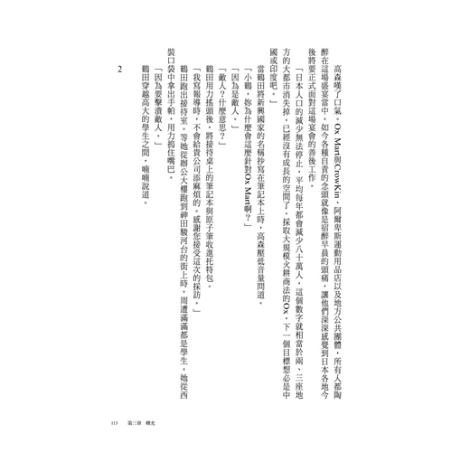 鶴田的報導毫不留情。不過她缺乏決定性的認知,沒有理解到這是場打著「自由競爭」之名的廝殺。要是Ox放緩攻擊手段,立刻就會遭到同業的其他公司暗算。無論要說這是企業的自私,還是要指責他們太過霸道,公司都絕對不能停止成長。