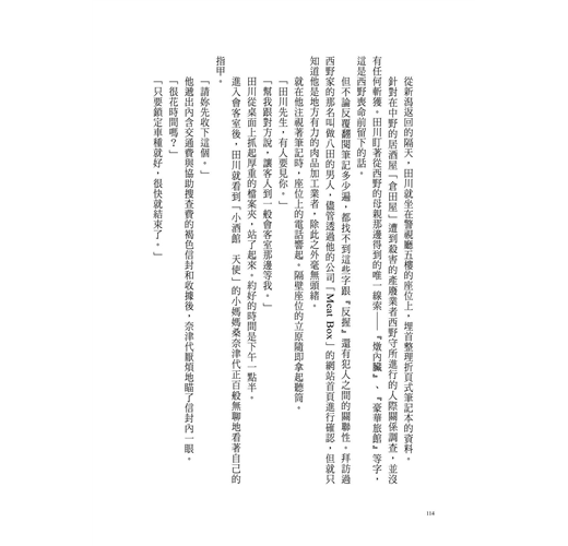 田川在全新的折頁式筆記本上動著鉛筆。寫著案件名的第一頁上,馬上就填滿了密密麻麻的文字。