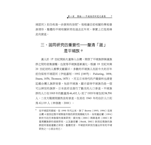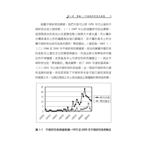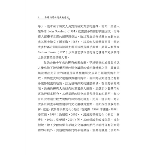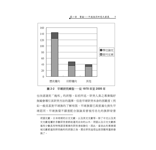 平埔研究與台灣許多流行事物一樣,從默默無聞,到突然爆紅,最後又歸於平靜。在1980年代以前,甚少有人進行平埔研究,當時的平埔研究者甚至慨嘆平埔研究為「學術雞肋」。然而從1990年代中期到2000年這段期間,平埔研究就像是爆紅的蛋塔或海角七號電影一樣,在跨領域的學術界甚至民間的文史工作者之間掀起了一股熱潮,各式各樣的平埔研究或尋根探源的工作,在這一段期間有豐富的發展。而筆者也像一般的市場大眾一樣,在1998年這段平埔研究市場進入高峰時投入關注,開始注意平埔族的相關事務。如果將學術研究比擬為股票市場,平埔研究這檔熱門股已經在2000年達到最高點(詳見第一章),這也意味著筆者進場的時間已經太晚了。而事實證明,筆者在2004年才完成第一本平埔研究論文,那時平埔研究已經處於下跌的階段了。當下平埔研究已非熱門股,但是很慶幸地它還沒有到達下市的境地,還是有許多同好持續進場關注。不過,無可否認地,今日的平埔研究已不復昔日的榮景,希望這本書的出版,能為低迷的平埔研究市場,注入一點活水。