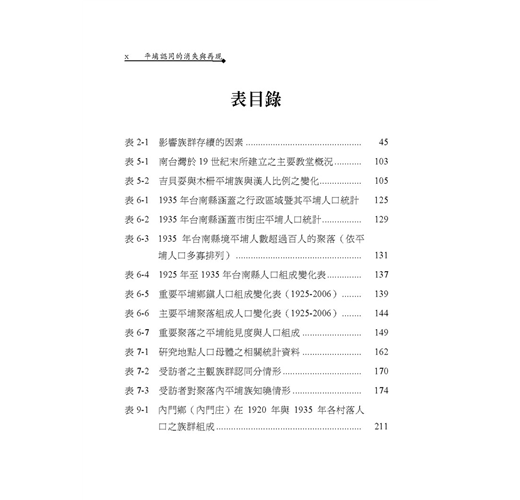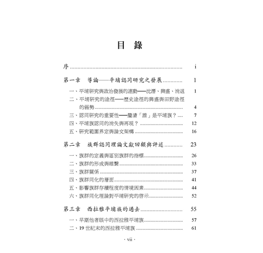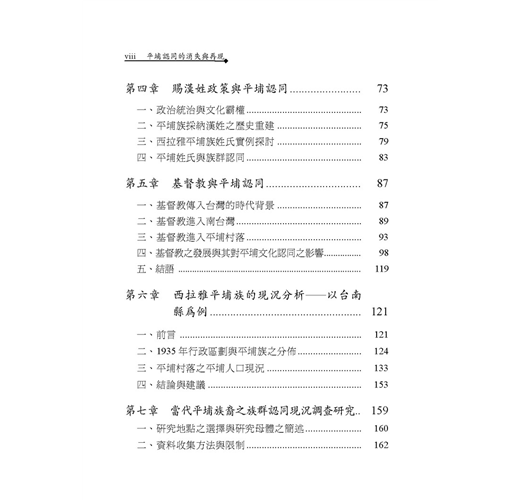 本書雖然大多數之章節內容都已曾經發表過,但將全文之邏輯彙整,文辭之潤飾、增刪等工作,也必須耗費許多時間。將文章集結成書的想法事實上已經有一段時間了,但卻一直無法付諸實行。本書的完成,我要特別感謝我的妻子,若非她的支持與督促,本書之完成恐怕不知還要延宕至何時。此外,我也要謝謝娃娃與佳佳這兩個可愛孩子的體諒,我必須犧牲陪伴他們的時光,閉關在電腦桌前敲敲打打。當然,若非岳父岳母多所犧牲,特別南北兩地奔波幫忙照顧小孩,本書也無法完成。再者,我要感謝所有協助我進行研究的人,特別是提供我研究靈感的我敬愛的父親母親與兄長們,接受我訪談的平埔族裔、漢族裔,以及協助田野訪談的研究助理們,沒有你們的幫忙不可能有具體的研究內容出現。我也要感謝東華大學原住民民族學院的出版,尤其是院長施正鋒教授的敦促與協助,讓本書能在緊湊的期限內順利付梓。最後,感謝翰蘆出版社編輯部的校稿與編輯,有你們專業且有效率的協助,讓本書更具可看性。