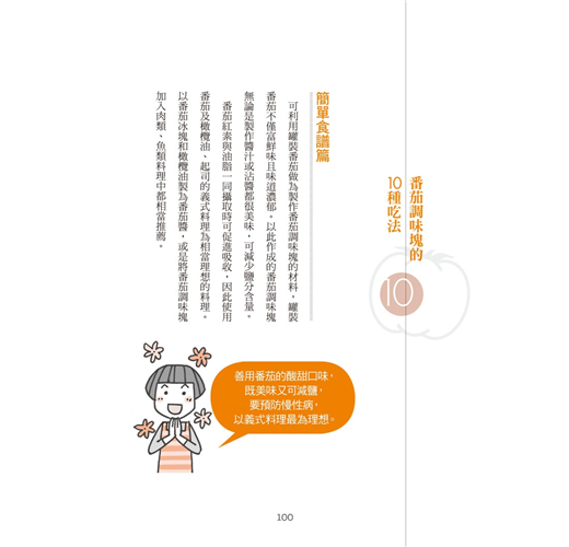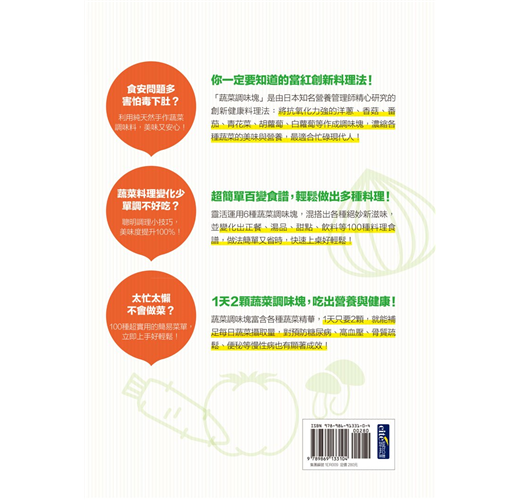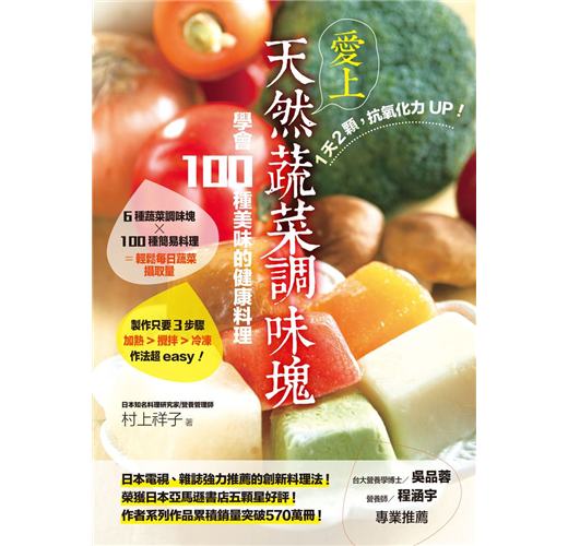 「蔬菜調味塊」是由日本知名營養管理師精心研究的創新健康料理法:將洋蔥、香菇、番茄、青花菜等蔬菜作成調味塊,可應用在正餐、湯品、甜點、飲料等各種料理中,並附上實用簡易食譜,靈活運用6種蔬菜調味塊混搭出絕妙新滋味, 100種簡易料理,讓你輕鬆攝取各種蔬菜的營養精華,達到抗老化、提高免疫力、強健骨骼、消除便祕、降低血糖及血壓、瘦身減肥等健康效果,再忙也能天天吃,是一本最適合現代人的健康養生食譜。