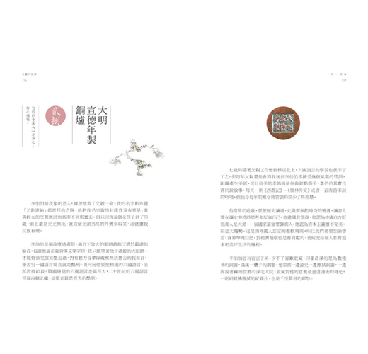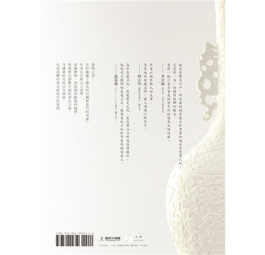 器物之美,在於蘊藏了歷史的沉澱與當代的美感,在萬千物品中,作者挑選出以美感為前提的收藏之物,在時代的流光中,典藏著古典的美學,看似顛沛脆弱的她們,卻凝聚出靜默不語的深沉力量,守護著時代的日月移徙,化成流轉的華光給現代的我們。