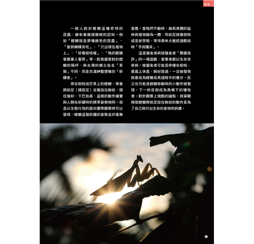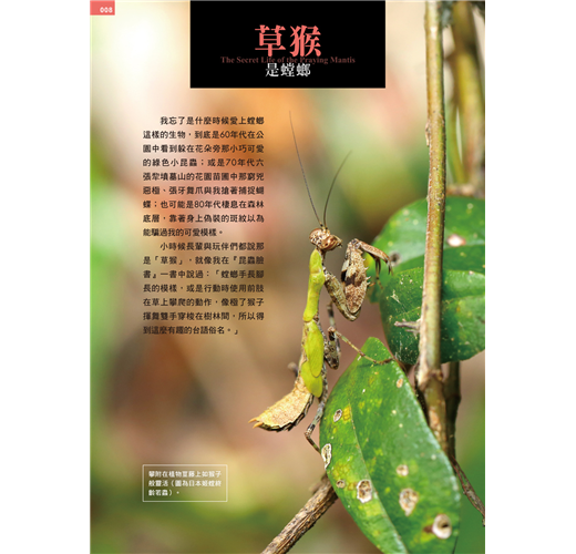 猶記我大一剛唸昆蟲系時,在某次因緣際會中,取得了剛從螵蛸出來的斧螳若蟲,我將牠們當成寵物養在宿舍裡,然後每天到浴室捉蛾蚋給牠們吃,許多女生都用異樣眼光看著我。等螳螂大些,我再捕捉較大蟲子餵食,每脫一層皮,就以膠帶將蛻黏好,並寫下蛻皮記錄,還曾好奇地用繩子綁著蝗蟲屍體在螳螂前面晃動,看牠們會不會被騙而捕食。更荒謬的是,我當時還用黑色奇異筆將螳螂的複眼塗黑,看螳螂是否還能捉到獵物。當時的試驗結果已不復記憶,但肯定的是,所做的粗糙試驗只希望能更進一步瞭解既可怕又可愛的螳螂習性。如果阿傑的書早在我捉到螳螂前就出版了,搞不好,我會深受吸引而一頭栽進螳螂世界,成為螳螂分類學家。真是相見恨晚。