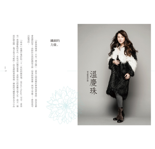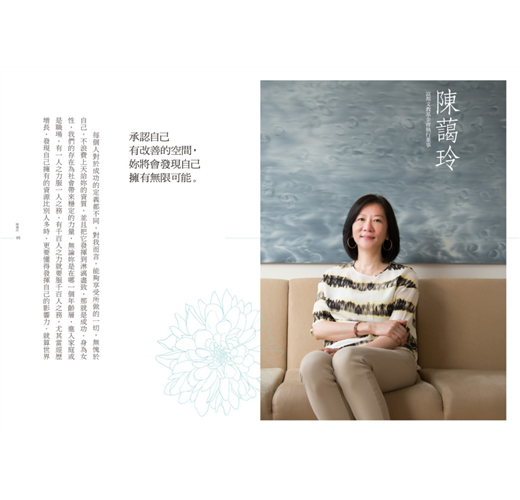 這本書中,集結了二十位臺灣頂尖女性領導者的手稿,將她們在職場上克服困難,邁向成功,實現夢想中的領悟,在書中跟大家分享。我根本無法想像,中文只有小學程度及對於臺灣出版業毫無概念的我,在完全沒有任何人脈及關係的情況下,靠著一股理念堅持與熱忱,一個一個地搜尋與聯絡、一步一步地學習與摸索,整合了臺灣各界高階女性領導者的職場智慧,把這本書做出來。正因如此,我在此要對這群前輩獻上深深感謝,感謝妳們願意支持一個不認識的女孩達成她的夢想,感謝妳們對於提攜年輕女性的熱情與決心,本書才得以發行。