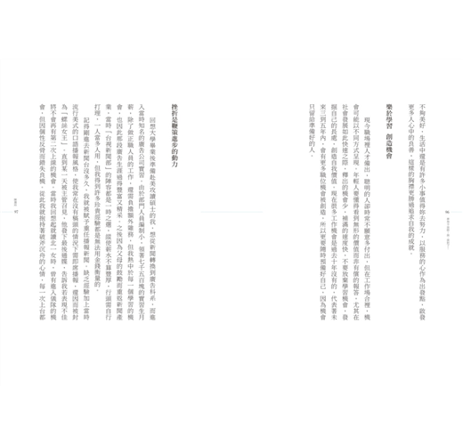 我希望這本書能幫助我們,以全新的思維去檢視我們工作的態度─不再只是為了應付家計而默然承受;不再只是等待工作五天後的週末玩樂;不再只是交差了事,而是重新發掘心中的夢想,再次點燃心中的熱忱,才能讓我們把一份份的工作轉變成終身的事業,邁向人生的下一個高峰。