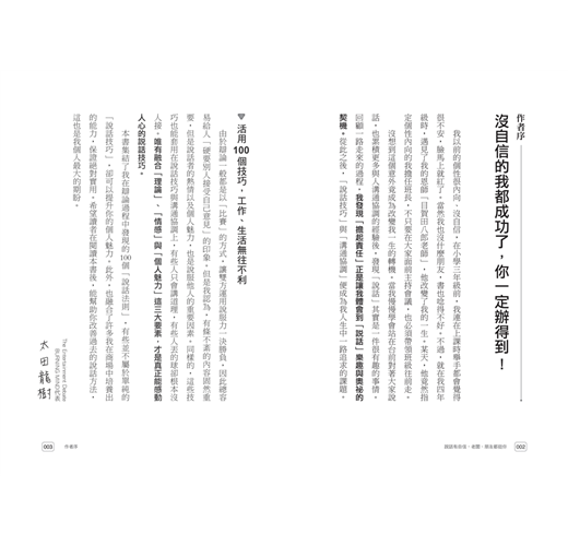太田龍樹後來還因此迷上了辯論的技巧,連續六年在大規模辯論比賽中奪冠。可是他認為辯論並非是用言語打敗他人,而是融合說話技巧與個人魅力,自然地讓別人認同你,其中的關鍵就在於「自信」!