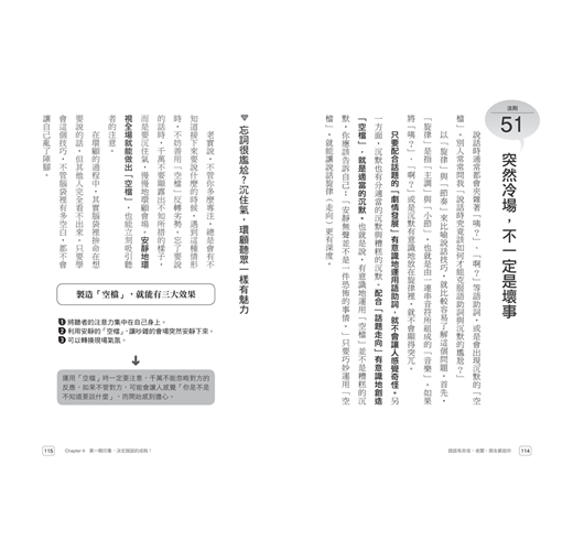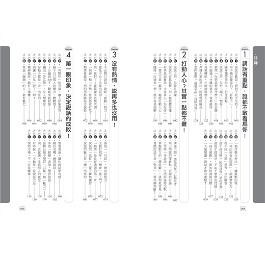 作者雖是「超強說話專家」,但他自己過去也害怕說話,而且個性非常內向,所以他很了解不擅言詞的人弱點在哪裡。為了要幫各位突破心理障礙,作者在書中循序漸進傳授「絕對實用」的說話技巧: