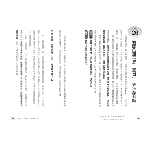 假設你的意見與社長或上司不同,你很可能會在溝通的過程中被對方的威嚴或存在感影響,讓你的情感開始動搖。此時,只要記住以下兩大祕訣: