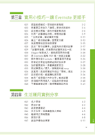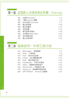 本書第一章介紹Evernote的基本操作,第二章是目前較常被使用的外部工具,第三章則是一些使用小技巧,讓使用者可以找到最適合自己的操作方式,第四章中分享筆者自身的使用經驗,期待能以淺白而詳實的說明,讓各年齡層的使用者都能輕鬆熟悉Evernote的使用,在生活上與工作上都為自己累積更多寶貴的知識庫,並能節省更多整理資料的時間,更多享受在自己喜愛的領域。
