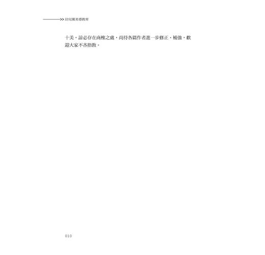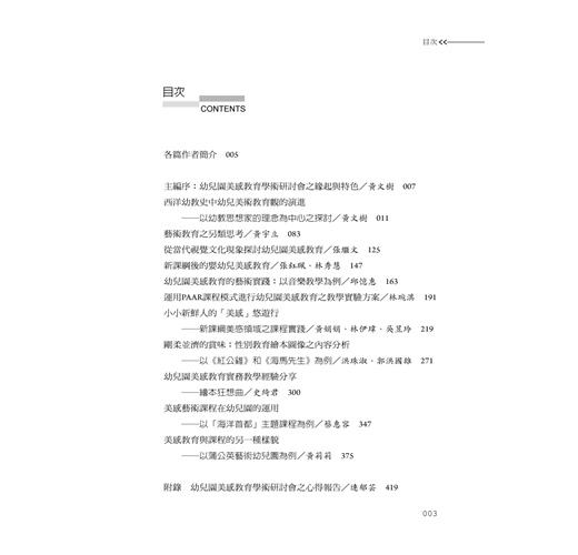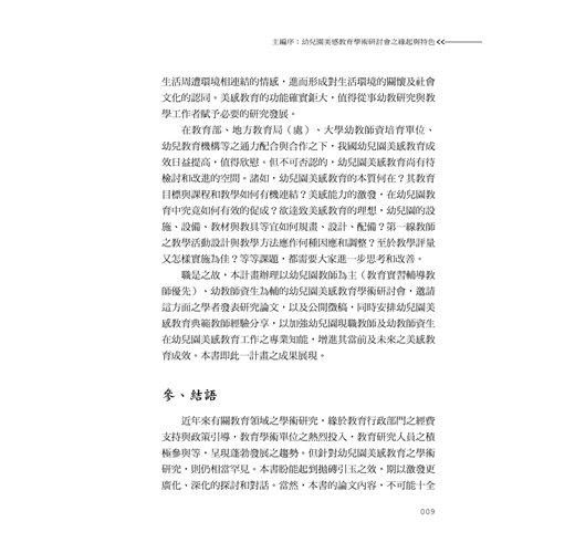 近年來有關教育領域之學術研究,緣於教育行政部門之經費支持與政策引導,教育學術單位之熱烈投入,教育研究人員之積極參與等,呈現蓬勃發展之趨勢。但針對幼兒園美感教育之學術研究,則仍相當罕見。本書盼能起到拋磚引玉之效,期以激發更廣化、深化的探討和對話。當然,本書的論文內容,不可能十全十美,諒必存在商榷之處,尚待各篇作者進一步修正、補強,歡迎大家不吝指教。