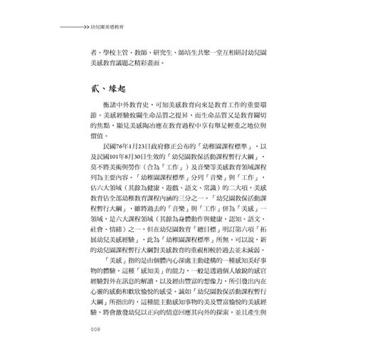 本書主題幼兒園美感教育之學術研究,具有獨特性,市面上相當罕見,最為此領域研究者重要參考依據。