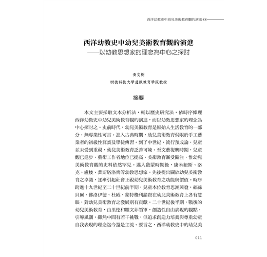 關鍵詞: 西洋幼教史、幼兒、美術教育觀、幼兒繪畫、幼教思想家