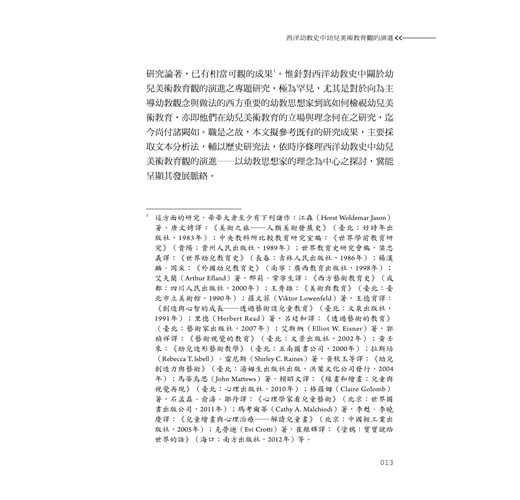 本文主要採取文本分析法,輔以歷史研究法,依時序條理西洋幼教史中幼兒美術教育觀的演進,而以幼教思想家的理念為中心探討之。史前時代,幼兒美術教育是原始人生活教育的一部分,無專業性可言。進入古典時期,幼兒美術教育侷限於手工藝業者的初級性箕裘及學徒傳習。到了中世紀,流行預成論,兒童並未受到重視,幼兒美術教育乏善可陳。至文藝復興時期,兒童觀已進步,藝術工作者地位已提高,美術教育漸受關注,惟幼兒美術教育觀的史料依然罕見。邁入啟蒙時期後,康米紐斯、洛克、盧梭、裴斯塔洛齊等幼教思想家,先後提出關於幼兒美術教育之卓識,逐漸引起社會正視幼兒美術教育之功能與價值。時序跨進十九世紀至二十世紀前半期,兒童本位教育思潮興發,福祿貝爾、佛洛伊德、杜威、蒙特梭利諸賢在幼兒美術教育上各有慧眼,對幼兒美術教育之發展別有貢獻。二十世紀後半期,戰後的幼兒美術教育,由里德和羅文菲領軍,創造性自由表現的觀點,引導風潮,雖然中間有若干挑戰,但追求創造力培養與尊重幼童自我表現的理念迄今還是主流。要言之,西洋幼教史中的幼兒美術教育觀的演進,與各時代社會的兒童觀及藝術觀是相應的,大致是一條由無到有,由漠視到重視,由哲學思考到心理學研究,由成人中心到兒童本位,由提供樣式到自發性自由表現,由關注手眼感官能力之發展到關注想像力及創造力之開發等趨勢向前進步。