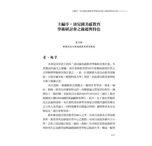 主編序:幼兒園美感教育學術研討會之緣起與特色/黃文樹