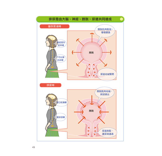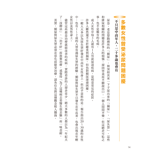 男性頻尿的主因較為單純,多為前列腺肥大。相對的,女性頻尿、尿失禁的因素便複雜許多,包括懷孕、生產都會對骨盆底造成傷害,或許這就是成為母親的代價。因此希望各位能瞭解,對女性而言,泌尿道問題絕非羞恥的疾病。如果您還是感到一絲不安,可以先閱讀本書,讓自己知道到底是怎麼一回事。