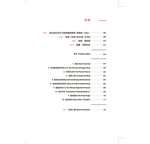 楊傑美 James Webb Young(1886年~1973年) 美國傳奇廣告大師、廣告創意魔島理論的集大成者。在智威湯遜廣告公司(JWT)任職達52年之久,除了本書外,另著有《廣告人日記》(The Diary of an Ad Man)、與《如何成為廣告人?》(How to Become an Advertising Man)等知名廣告學著作。1946年,獲頒「年度廣告人獎」(Advertising Man of the Year Award)和「廣告獎金牌」(Advertising Awards Gold Medal)。1974年,逝世一年後獲頒「廣告殿堂榮譽獎」(Advertising Hall of Fame)。