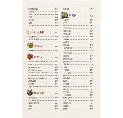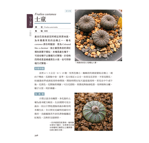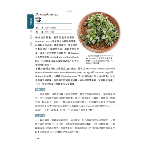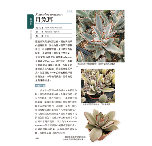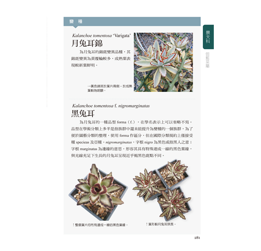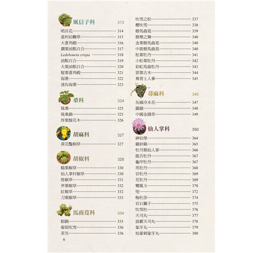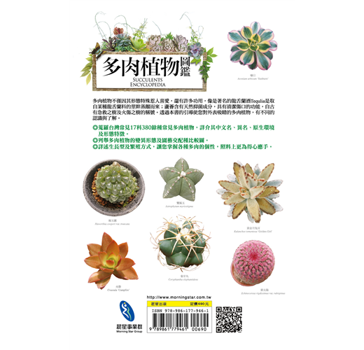 ■蒐羅台灣常見17科380餘種常見多肉植物,詳介其中文名、異名、原生環境及形態特徵。