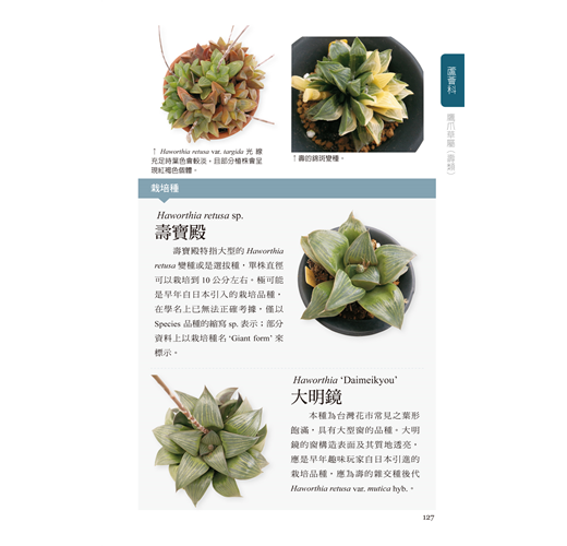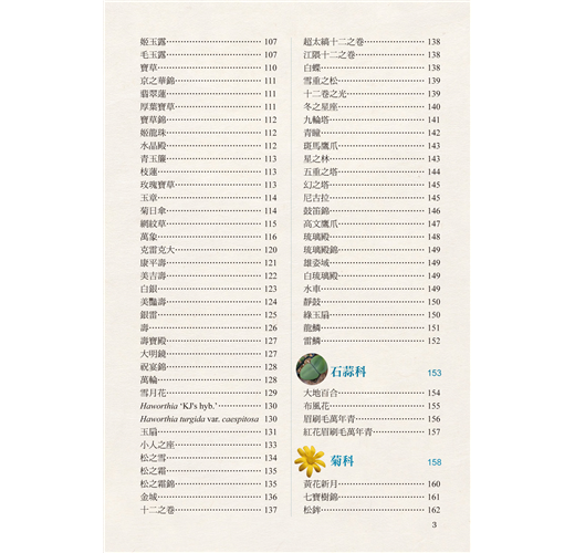 皮刺蘆薈∕木立蘆薈∕木立蘆薈錦∕綾錦∕短葉蘆薈∕獅子錦∕美紋蘆薈∕第可蘆薈∕皇璽錦∕黑魔殿∕毛蘭∕Aloe haworthioides ‘KJ’s hyb.’∕拍拍蘆薈∕黑童子∕臥牛∕春鶑囀∕黑春鶯囀∕姬墨鉾∕白星龍∕赤不動∕白雪姬∕虎之卷∕磯松錦∕子寶錦∕富士子寶∕美鈴富士子寶∕象牙子寶∕比蘭西臥牛∕恐龍臥牛∕Gasteria rawlinsonii∕蛛絲牡丹∕毛牡丹∕曲水之宴∕曲水之泉∕曲水之扇∕厚葉曲水之宴∕天草∕青雲之舞∕櫻水晶∕狄氏玉露∕刺玉露∕白斑玉露∕姬玉露∕毛玉露∕寶草∕京之華錦∕翡翠蓮∕厚葉寶草∕寶草錦∕姬龍珠∕水晶殿∕青玉簾∕枝蓮∕玫瑰寶草∕玉章∕菊日傘∕網紋草∕萬象∕克雷克大∕康平壽∕美吉壽∕白銀∕美豔壽∕銀雷∕壽∕壽寶殿∕大明鏡∕祝宴錦∕萬輪∕雪月花∕Haworthia ‘KJ’s hyb.’∕Haworthia turgid var. caespitosa∕玉扇∕小人之座∕松之雪∕松之霜∕松之霜錦∕金城∕十二之卷∕超太縞十二之卷∕江隈十二之卷∕白蝶∕雪重之松∕十二卷之光∕冬之星座∕九輪塔∕青瞳∕斑馬鷹爪∕星之林∕五重之塔∕幻之塔∕尼古拉∕鼓笛錦∕高文鷹爪∕琉璃殿∕琉璃殿錦∕雄姿域∕白琉璃殿∕水車∕靜鼓∕綠玉扇∕龍鱗∕雷鱗