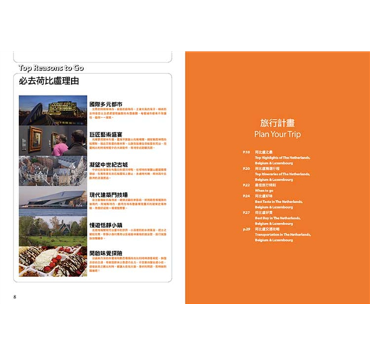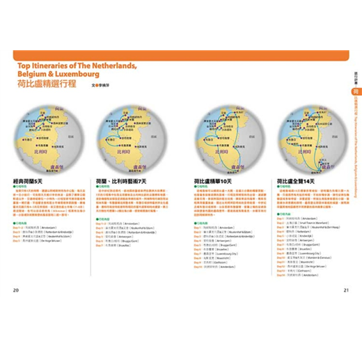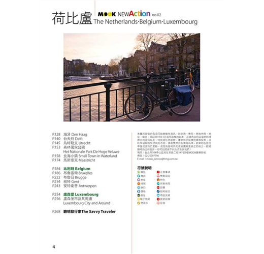 這本新版的《荷比盧》延續本系列的風格,在「分區導覽」以國家為劃分,再搭配清晰的地圖,詳列各城市完整的景點及最新的旅遊資訊。針對阿姆斯特丹、布魯塞爾等大城市並提供「散步路線」、「食、宿及購物」等全面性的主題介紹。此外,更為讀者做了有系統的整理,包含「荷比盧之最」、「精選行程」、「好味」、「好買」、「交通攻略」、「荷比盧小百科」、「聰明旅行家」等單元,不論是行前準備或是旅行途中,都是最容易上手的實用旅行指南。