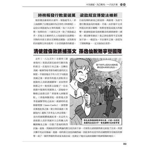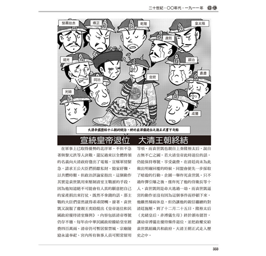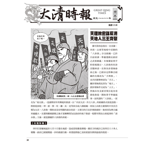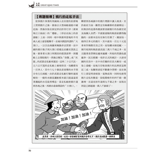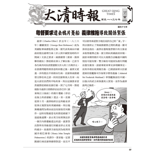 以二十萬字的內文、五百多則的新聞事件,以及三百多張作者自己親繪的插圖,帶領讀者以輕鬆有趣的方式來閱讀這段異常沉重的歷史,以迥然不同的角度來切入這段似懂非懂的往事。在相關的新聞版面,特別收錄了「衙門差役」、「鴉片的走私手法」、「林則徐的銷煙法」、「大清帝國國旗」、「義和團」等許多專題報導以增加閱讀的深度。而由於這時中國正與世界接軌,所以也特別在相關的時間點上,加入了「拿破崙成為法國皇帝」、「黑船來航日本震撼」、「美國爆發南北戰爭」、「林肯總統被刺身亡」、「德川幕府大政奉還」、「愛因斯坦發表狹義相對論」、「萊特兄弟試飛成功」等等的要聞,以便讓讀者更了解中國與當時國際趨勢之關係。