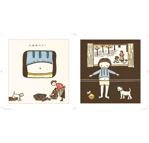 同時使用小狗的長大以及穿不下的衣物,來暗示孩子的成長;