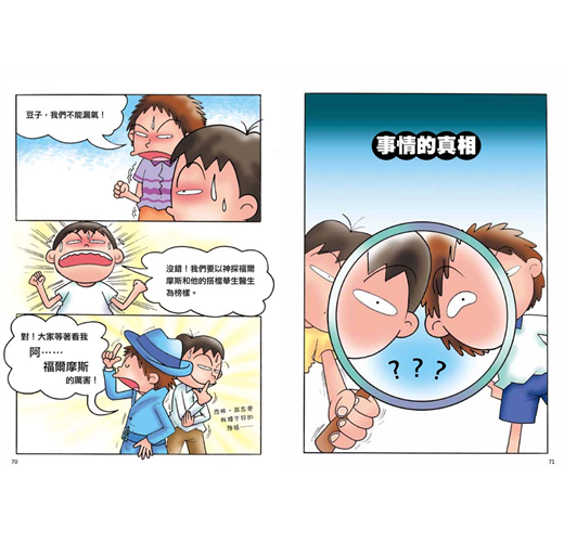 這套書以小朋友最喜歡的漫畫方式呈現,除了推理疑雲之外,每本書都有一個重點議題。「靈異事件」觸及了流浪貓狗的問題;「寶藏傳說」挖掘到很久以前的感人故事;「狗蛙消失之謎」加入了生態觀點;「恐怖照片散播事件」則是網路世代不可不知的資訊素養與倫理問題。除此之外,還有一本附加的「偵探護照」,裡頭有許多推理小遊戲,快來閱讀這套書,全面啟動你的大腦潛能吧!