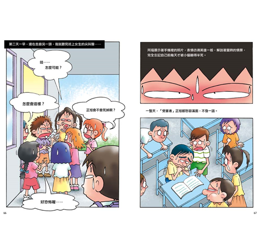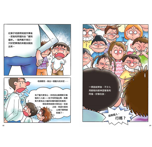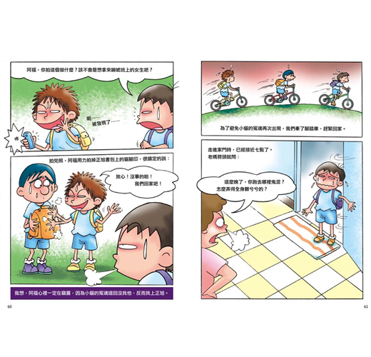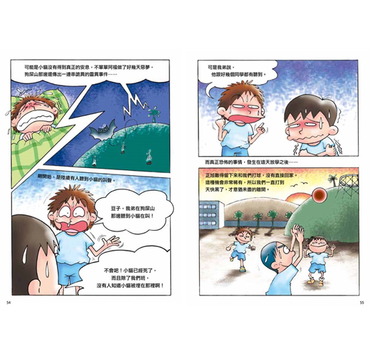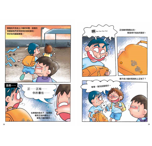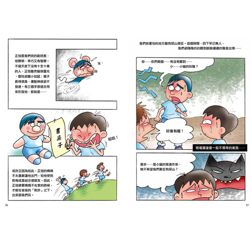 這四本書以小朋友最喜歡的漫畫方式呈現,是繪者花了很多心力完成的。除了幽默的故事情節和推理疑雲之外,每本書都還有一個筆者希望讀者能去注意到,能去關懷、關心的重點議題。例如「靈異事件」,觸及了流浪貓狗的問題;「寶藏傳說」挖掘到很久以前的感人故事;「狗蛙消失之謎」加入了生態觀點,希望讀者能意識到外來生物對環境造成的危害;「恐怖照片散播事件」則是現在經常使用網路的學生們,不可不去知道和遵守的資訊素養與倫理問題。