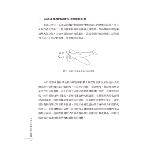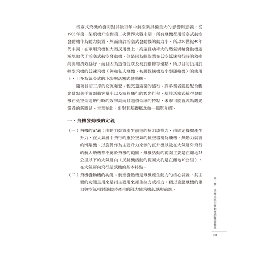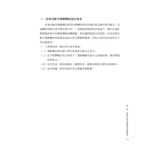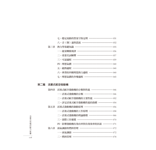 六、 本書利用簡明以及條列式的文字描述活塞式飛機的動力裝置(活塞式發動機與螺旋槳),而盡量不引用枯燥的數學演練,希望本書能成為一本介紹活塞式飛機的入門書籍,不僅可以提供航空相關科系CAA考照以及民航局高考與民航特考的參考,更可做為對航空工程有興趣學生的課外讀物以及二專、二技、大學航空相關課程使用。