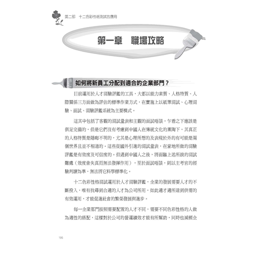 這套12色彩性格測驗是一個心理投射測驗,側重探索尚未被個體覺察的潛意識的內在動機。它以藝術而非語言的方式,讓人們在一種輕鬆活潑的氛圍中探索自我,同時又有心理測量學的科學支撐,是人格測量的一個有益的嘗試。--李焰(清華大學心理諮詢中心主任)
