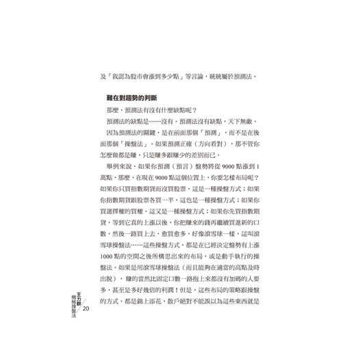 在弱肉強食的股市裡,散戶如同誤闖叢林的小白兔,一有風吹草動,只能憑直覺拔腿就跑。有人整日猜頭摸底,雖嚐到小甜頭,卻失去賺取整個波段的獲利;有人預設多空隨波轉折,最後虧損出局。王力群認為要致富,就是把「應該做的事」做好就好,不要去預測明天會發生什麼事。