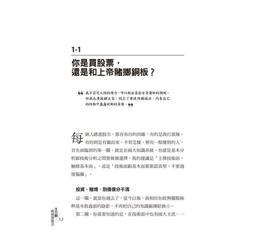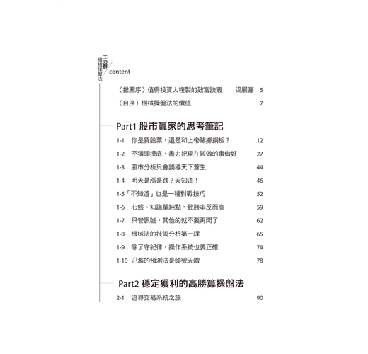第一,本書是台灣目前講述機械式操作法,最為全面且深入的一本劃時代作品。直到今天,預測式操作法一直大行其道,但是散戶能以此法穩定獲利者有幾人?不能穩定獲利,天天在股市打滾又是何苦來哉?所幸王老師為大家指出了一條坦途,那就是書中一提再提的機械式操作法。有王老師詳細地解說它的來龍去脈,相信有更多的散戶朋友,會跟我一樣選擇站在人數相對稀少的一邊。人少不是壞事,重點是「這一邊的錢才容易賺」。希望大家明白這個簡單的道理。