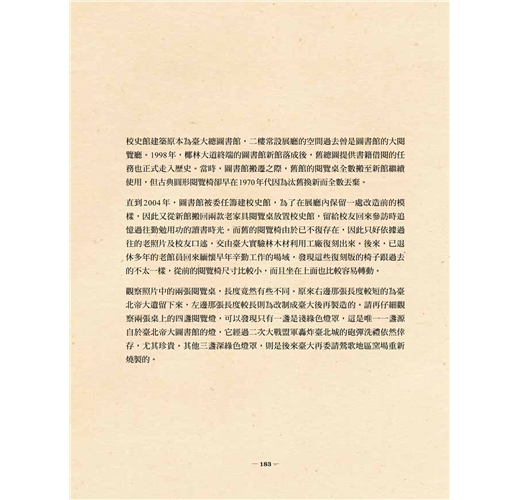 直到2004年,圖書館被委任籌建校史館,為了在展廳內保留一處改造前的模樣,因此又從新館搬回兩款老家具閱覽桌放置校史館,留給校友回來參訪時追憶過往勤勉用功的讀書時光。而舊的閱覽椅由於已不復存在,因此只好依據過往的老照片及校友口述,交由臺大實驗林木材利用工廠復刻出來。後來,已退休多年的老館員回來緬懷早年辛勤工作的場域,發現這些復刻版的椅子跟過去的不太一樣,從前的閱覽椅尺寸比較小,而且坐在上面也比較容易轉動。