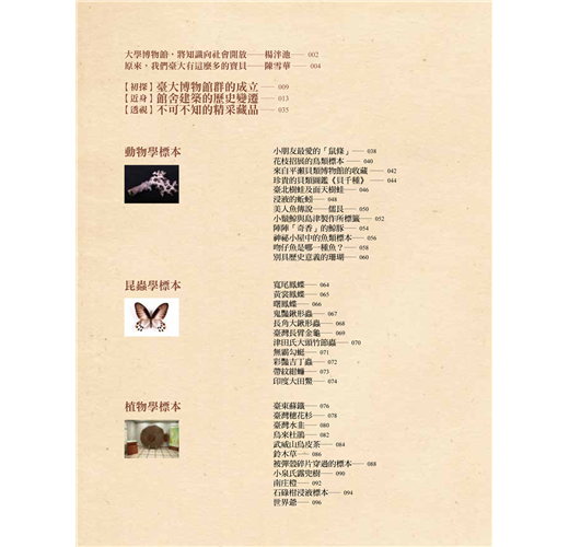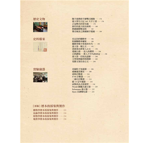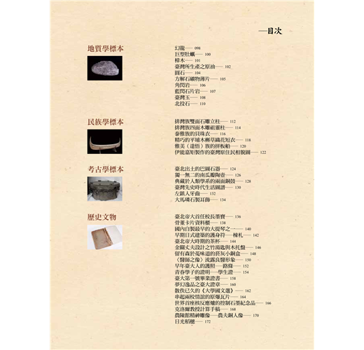當熱熱鬧鬧的活動與展覽過後,我靜下心來捫心自問,對於各館的藏品,我真的都認識嗎?我能輕鬆講出每個博物館的任何一件藏品嗎?作為圖書館館長,我清楚暸解圖書館的館藏,但是作為一個博物館群合作發展計畫的負責人呢?臺大含括了不同學科領域、收藏主題的博物館,隔行如隔山,也許就連博物館群的成員們也未必非常清楚明瞭彼此間深刻的館藏。博物館的基石,由豐富的館藏內容奠定,透過這次《標本.文物.我們的歷史:臺大博物館群與藏品精選》的出版,博物館群的老師與同仁們群策群力,各自端出了最自豪、最具特色、或最有故事性的藏品介紹,並且,這本書也納入了臺大博物館群之外的系所藏品,例如森林環境暨資源學系的植物標本、心理學系的古典實驗儀器。