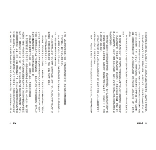 這位大約比他年長十歲、法律學系畢業的警官突然打破了沉默,用短促的語調突然問他,要不要他們開車送他回家?並且迅速補充了一句,說如果需要的話,他們非常樂意效勞。因為他既不想披上毛毯,他們也不希望把唯一的目擊者凍到感冒,他故意使用第三人稱複數當作盾牌,好像並不是他個人在提出建議,而是代表警方的整個群體。不過與此同時,他正透過群體的掩蔽,用這般犀利的目光盯著他。彷彿他想從刑事犯罪的角度,對可疑的區域進行搜查。或者說,他現在想從專業的立場,仔細審視這個來自另一個人群的樣本。